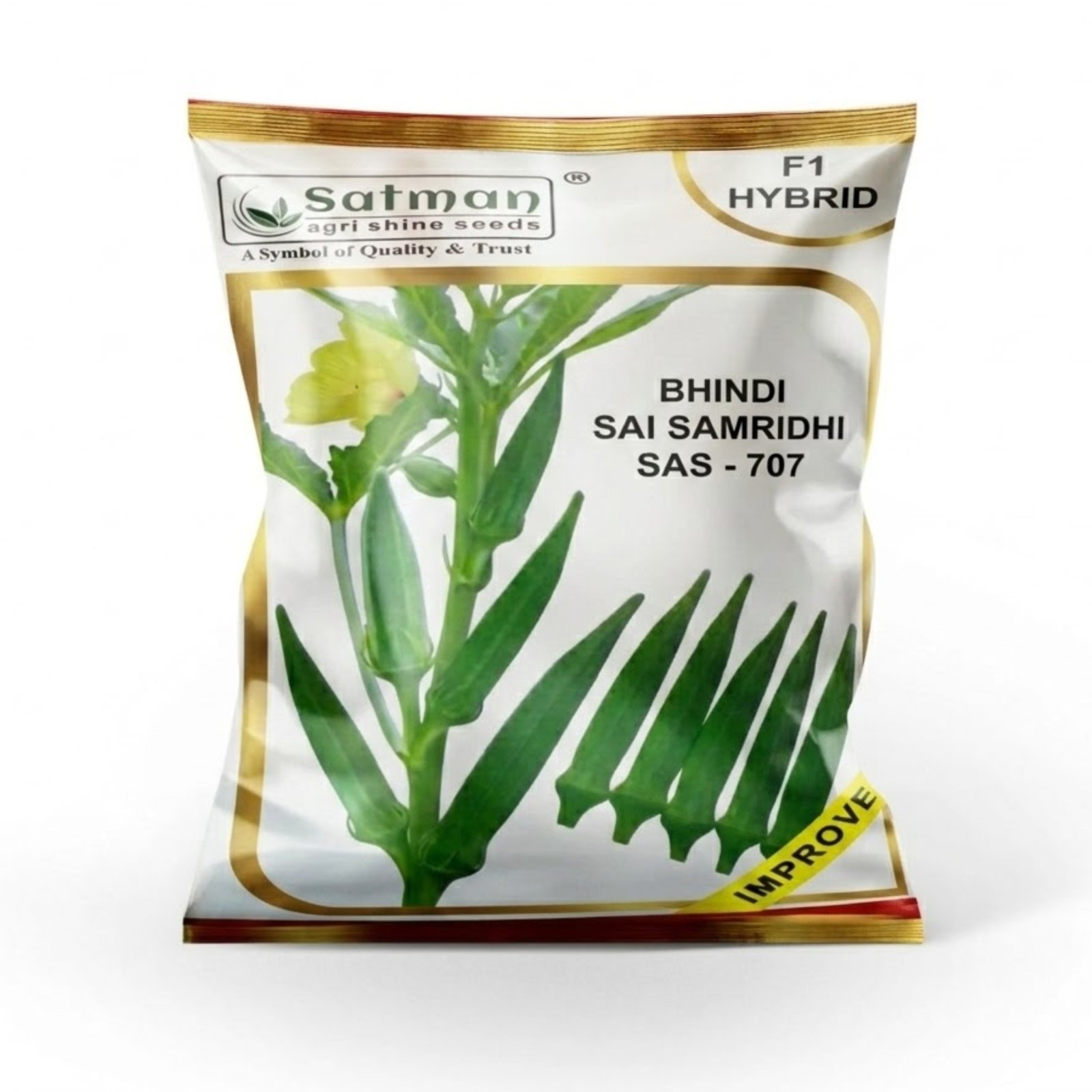 Bhindi Sai Samridhi SAS-707 F1 Hybrid Seeds by Satman Agri Shine Seeds are developed to provide high productivity and premium quality okra pods. This hybrid variety produces long, tender, and uniform green pods that are highly preferred in fresh vegetable markets.
