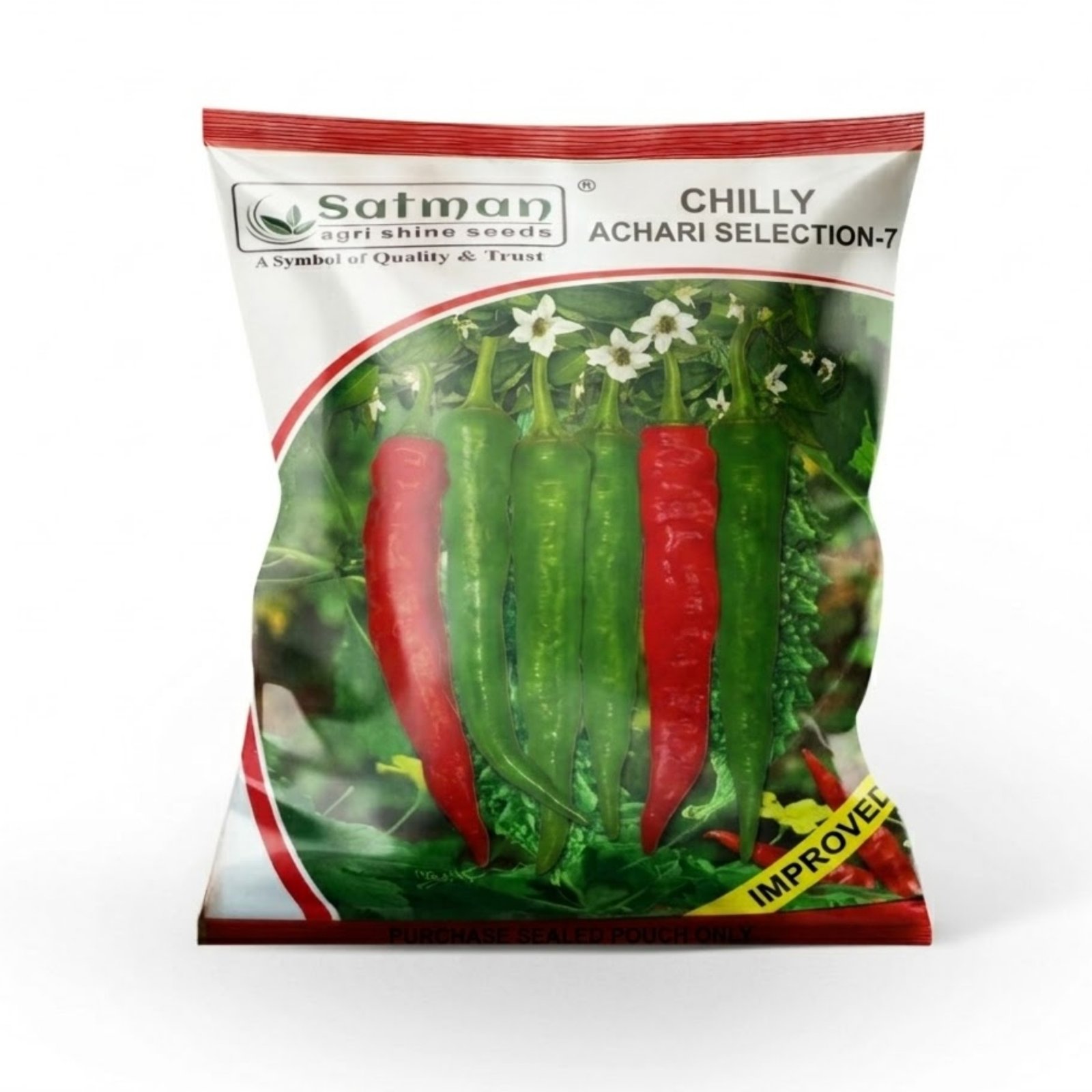 Satman Chilly Achari Selection-7 is a premium seed variety specially developed for high yield and excellent quality fruits. The plants produce long, uniform chilies that are green in the early stage and turn bright red upon maturity, making them ideal for both fresh use and pickling purposes.