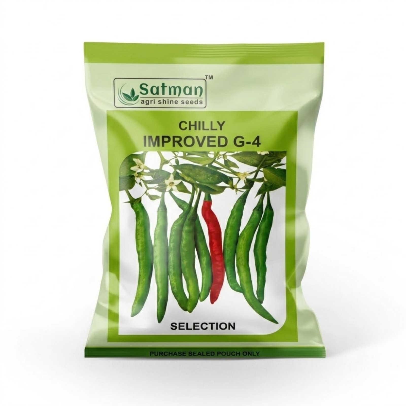 Satman Chilly Improved G-4 Selection is a premium seed variety developed for better yield, uniform fruit quality, and reliable performance. The plants produce long, slender chilies that are green during early stages and turn bright red when mature, making them suitable for both fresh and dried use.