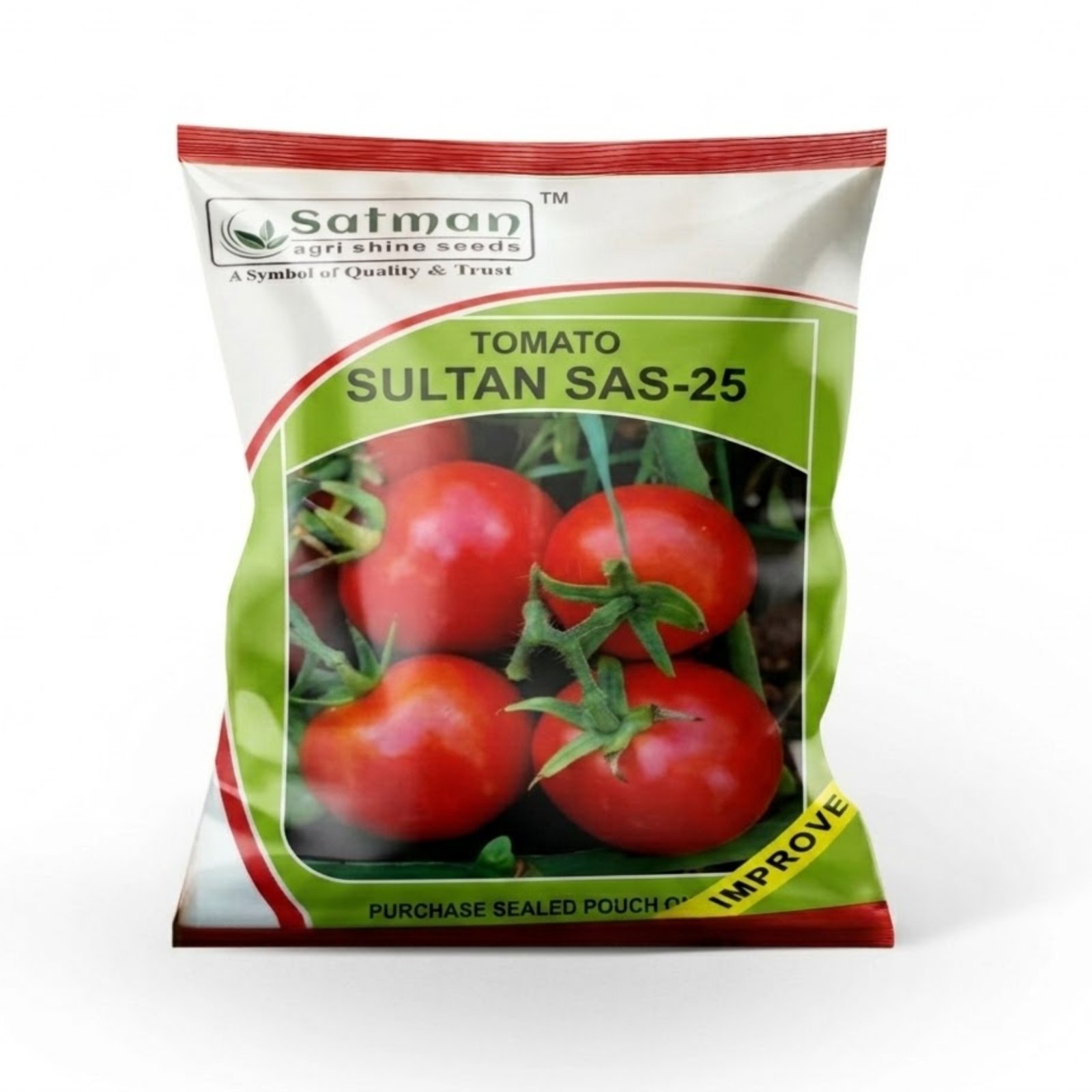 Satman Tomato Sultan SAS-25 is a premium seed variety developed for high yield and superior fruit quality. It produces uniform, round, and smooth tomatoes with a bright red color, making them highly appealing for market sales.